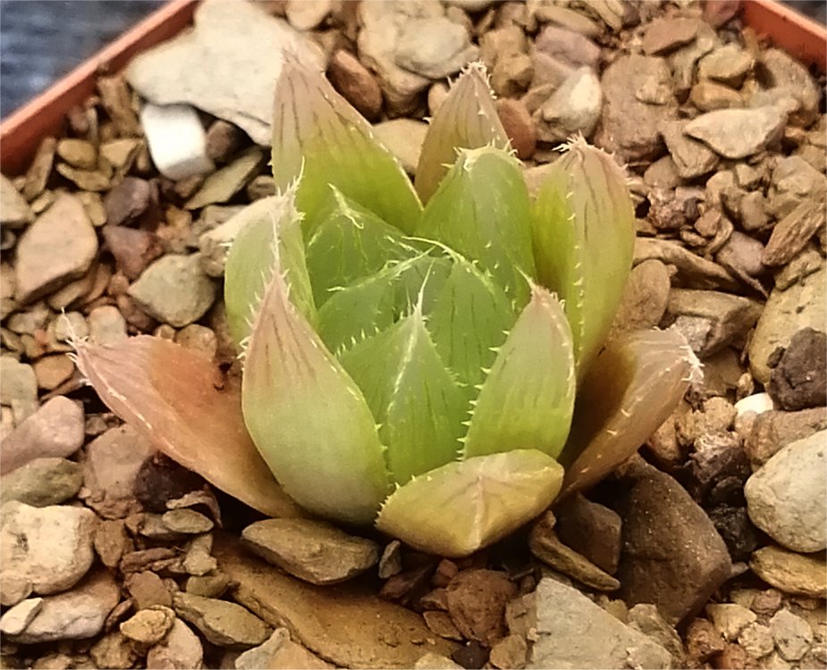 Haworthia mucronata - Buffelsdrift east of Ladismith VDV20170203A (Limited) Size (cm): 3.5 Origin: Vegetative propagation Cultivated by: HaworthiaGems Click on thumbnail to the right for more info or images.