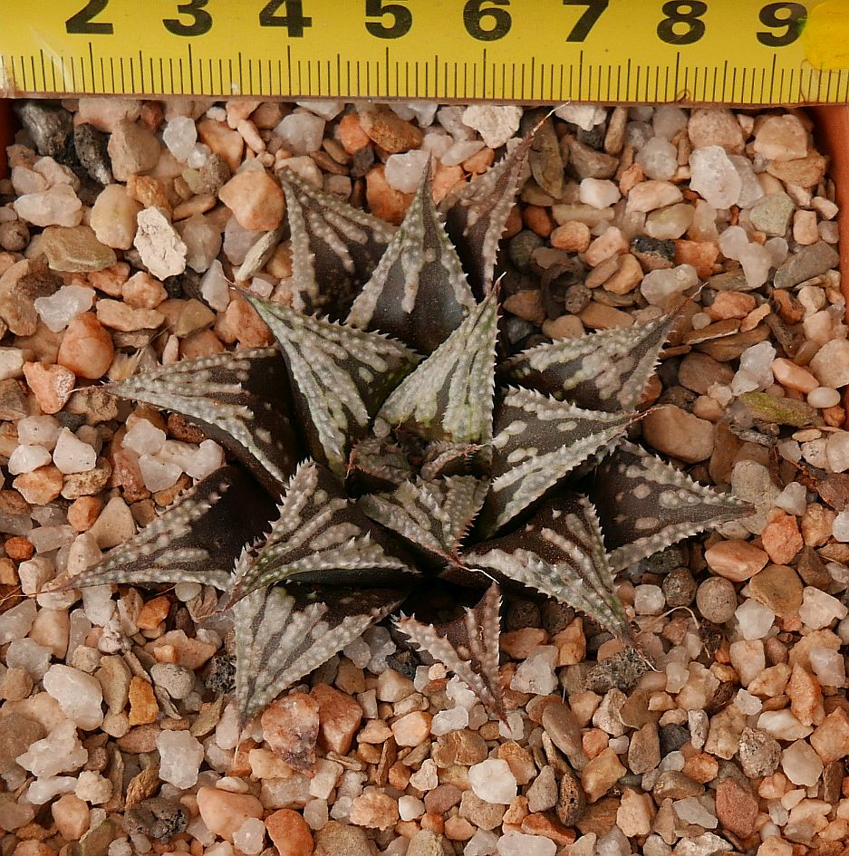 Name: Haworthia 'Sterling Star' x 'Carbon Shield' Size (cm): 7 cm wide Origin: Horticultural Hybrid Created by: Gerhard Marx Cultivated by: Gerhard Marx